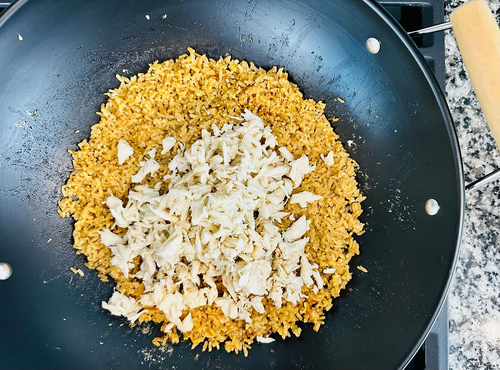 Step 12: Now, add the crab to the rice and stir fry thoroughly.