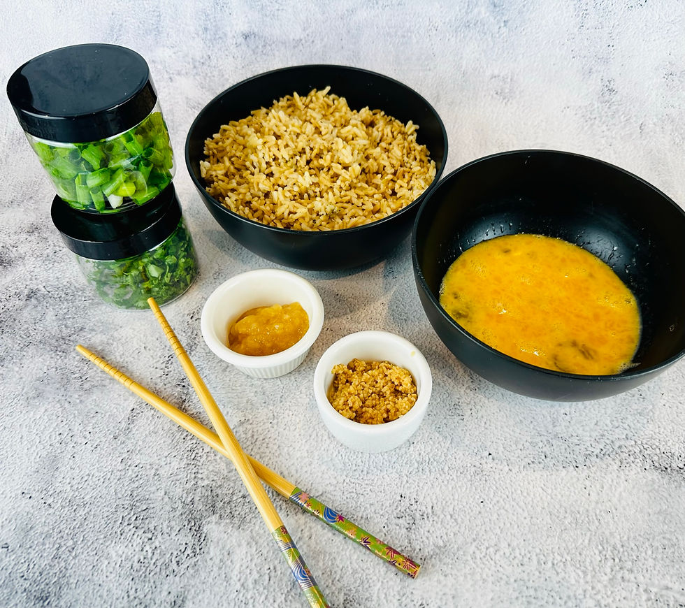 Step 1: PREP - Cook rice according to the package and prep all of the ingredients, including the aromatics (ginger, garlic, cilantro, and scallions). Prep the whisked eggs as well and set them aside. *Prep all of the ingredients to ensure a smooth cooking experience.