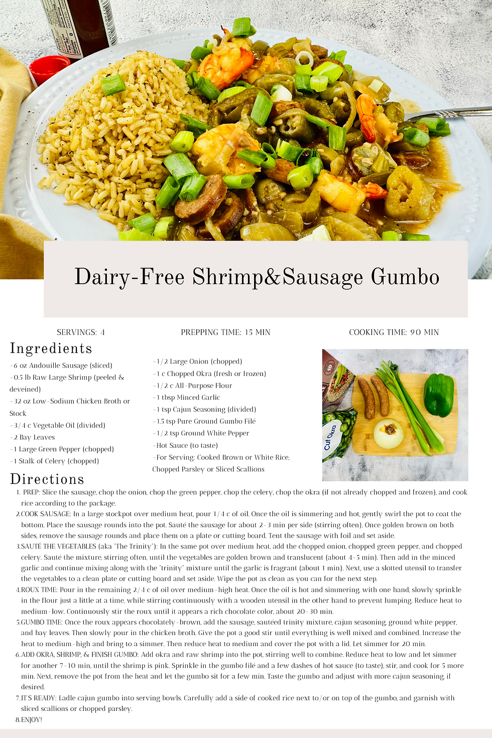 National Gumbo Day is October 12th! Let’s celebrate with a delicious and authentic New Orleans style Dairy-Free Shrimp and Sausage Gumbo. Gumbo is a soup/stew that is made from combinations of meat (chicken, ham, beef, sausage, etc.), seafood, and vegetables that is served hot over cooked rice. The dish can be thickened with file, okra, roux, or a mix of all. My recipe combines hearty vegetables, sausage, shrimp, and a side of brown rice.