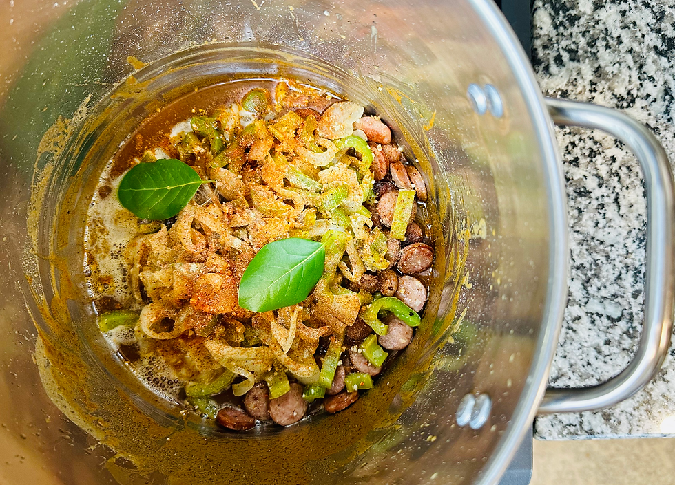 Step 9: GUMBO TIME - Once the roux appears chocolately-brown, add the sausage, sautéed trinity mixture, cajun seasoning, ground white pepper, and bay leaves.
